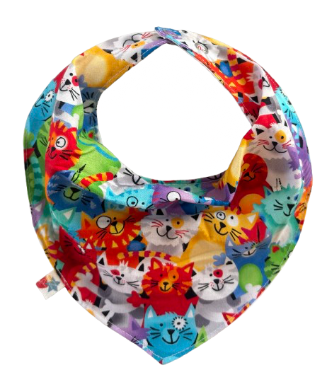 Babero bandana impermeable gatitos multicolores. Confeccionado en algodón con una capa impermeable, para que la humedad de la babita no pase a la ropita, ni al cuerpito de tu bebé. Tiene dos broches para que lo acompañe en su crecimiento.