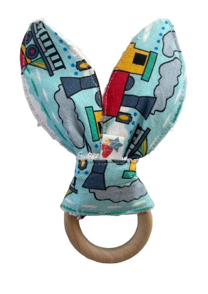 Está compuesto de una argolla de madera 100% natural, acompañado de dos orejitas de tela estampada y toalla, ambas 100% algodón. ¡Lavable!